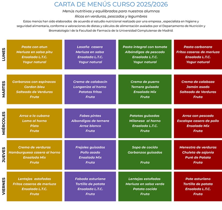 Los platos del menú escolar del curso 2025-2026, ya disponibles en el archivo adjunto o en el apartado 'Documentos' de OBYeduca.